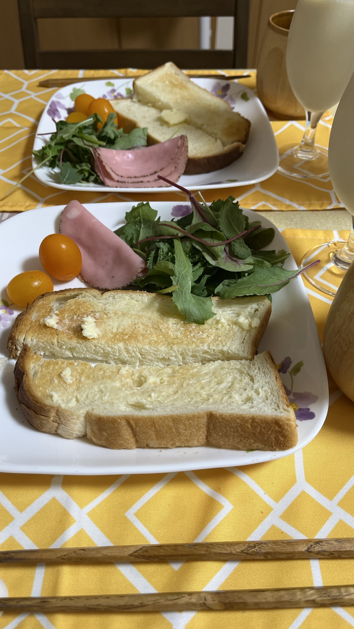 トーストを普通に焼いて、野菜だけをぼんと載せた簡単朝食。
