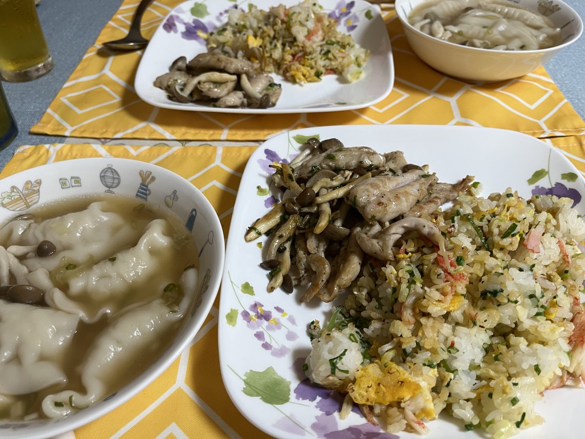 カニカマ炒飯・水餃子スープ・鶏のせせり肉ときのこのレモン炒め