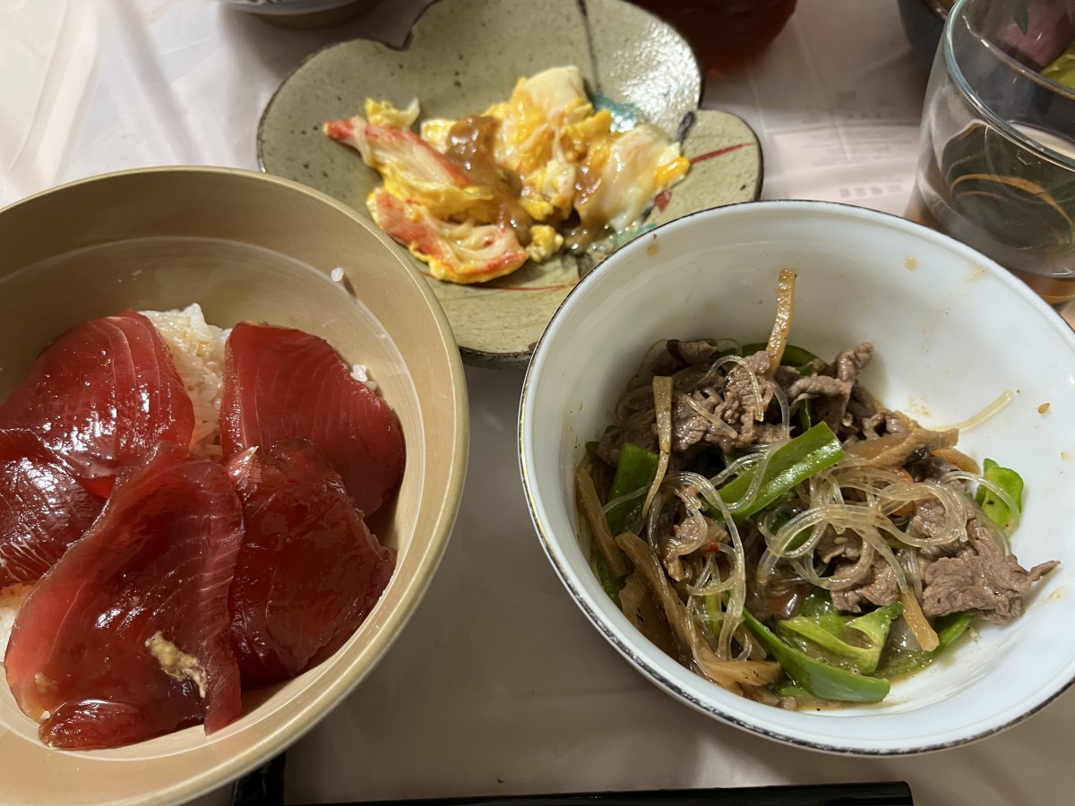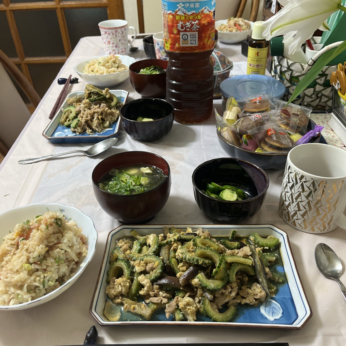 ゴーヤチャンプル・カニカマ炒飯・胡瓜の酢の物・豆腐の味噌汁