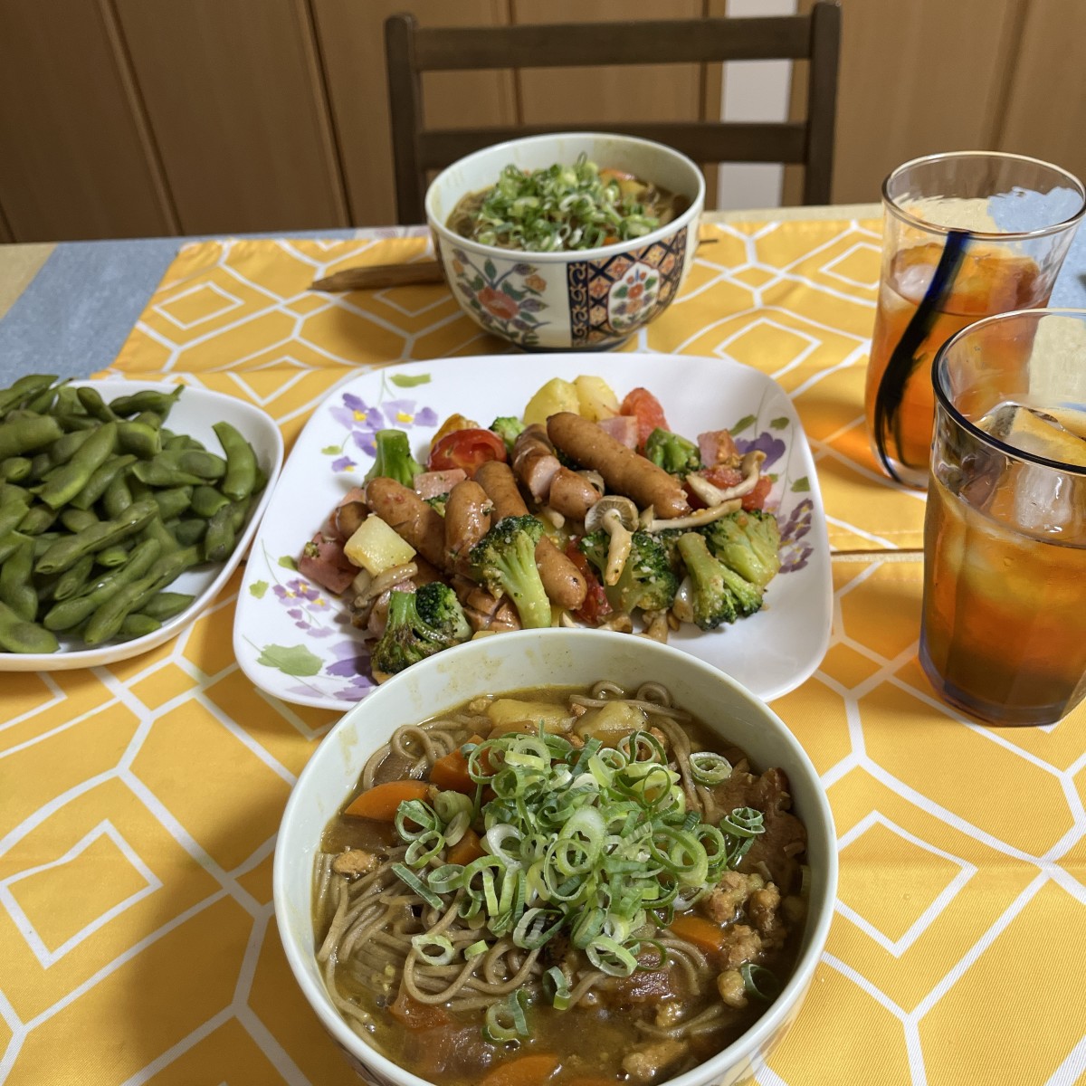 カレー鴨南蛮蕎麦・ニンニクたっぷりジャーマンポテト・枝豆🫛